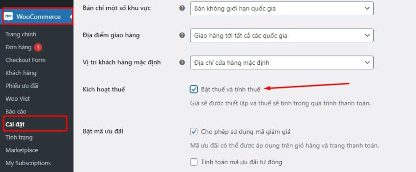 Đầu tiên, chúng ta cần phải kích hoạt chức năng thuế cho website WordPress.