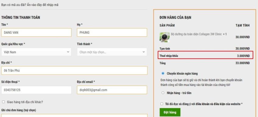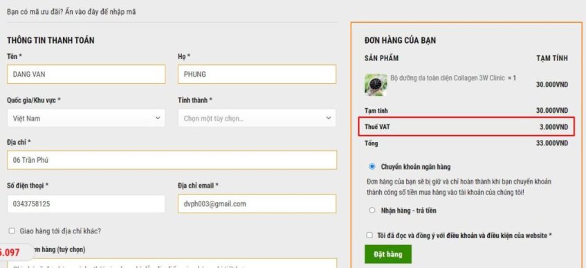 Sau khi tạo xong, mình ra trang chủ thêm sản phẩm vào giỏ hàng, tiến hành thanh toán, chọn quốc gia, tỉnh thành. Thuế cho sản phẩm được tính trên giao diện trang thanh toán như sau: