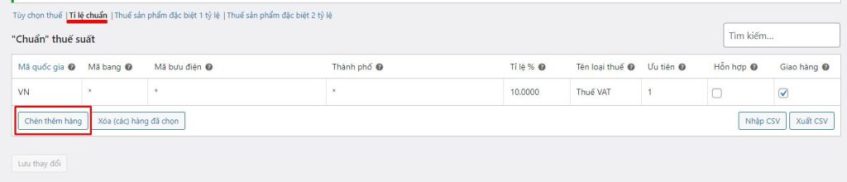 Mình sẽ cài đặt tỉ lệ chuẩn trước. Tỉ lệ chuẩn này sẽ áp dụng cho toàn bộ sản phẩm trên website. Bây giờ chúng ta nhấn vào loại hình tỉ lệ chuẩn. Để thêm một tỉ lệ thuế, bạn bấm nút Chèn thêm hàng để bắt đầu